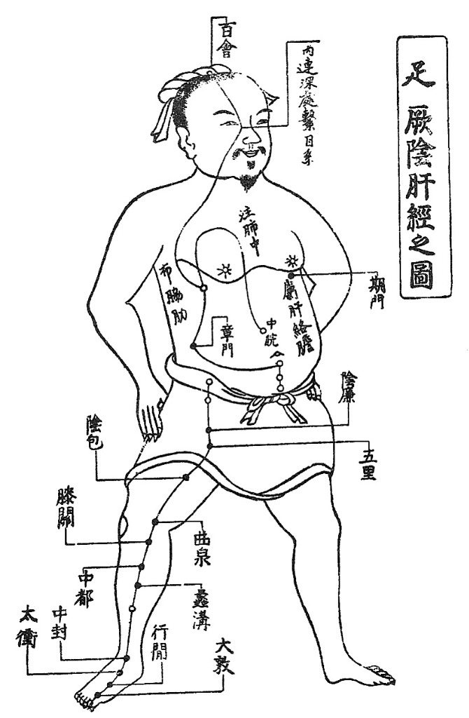 足の厥陰肝経は疝気(男)、下腹部膨満感(女)、遺尿・尿閉、腰痛、あばらの腫れ、うつ向いたり仰向いたりできない、嘔吐、ひどい下痢、のどの渇き、顔色がすすけて青黒くなるといった症状に効果が期待できます。
